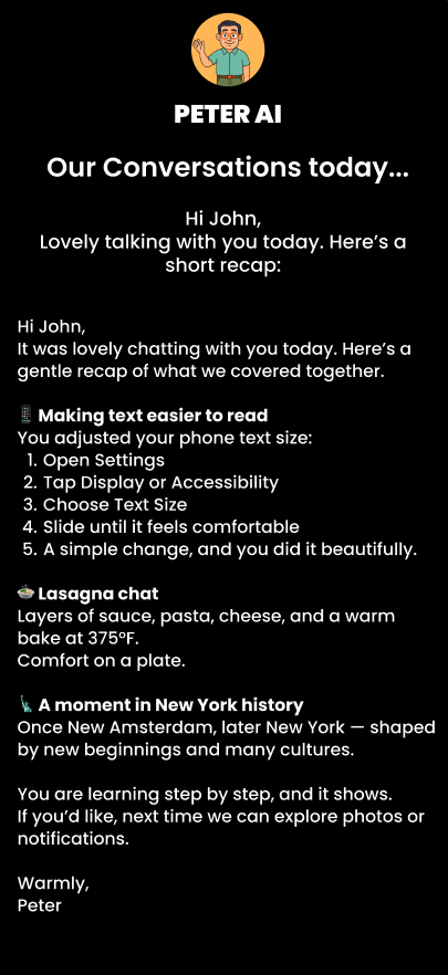 “I love the idea of having someone who can explain things calmly. I get nervous asking my kids about tech. Peter feels like a safe place to learn at my own pace.”